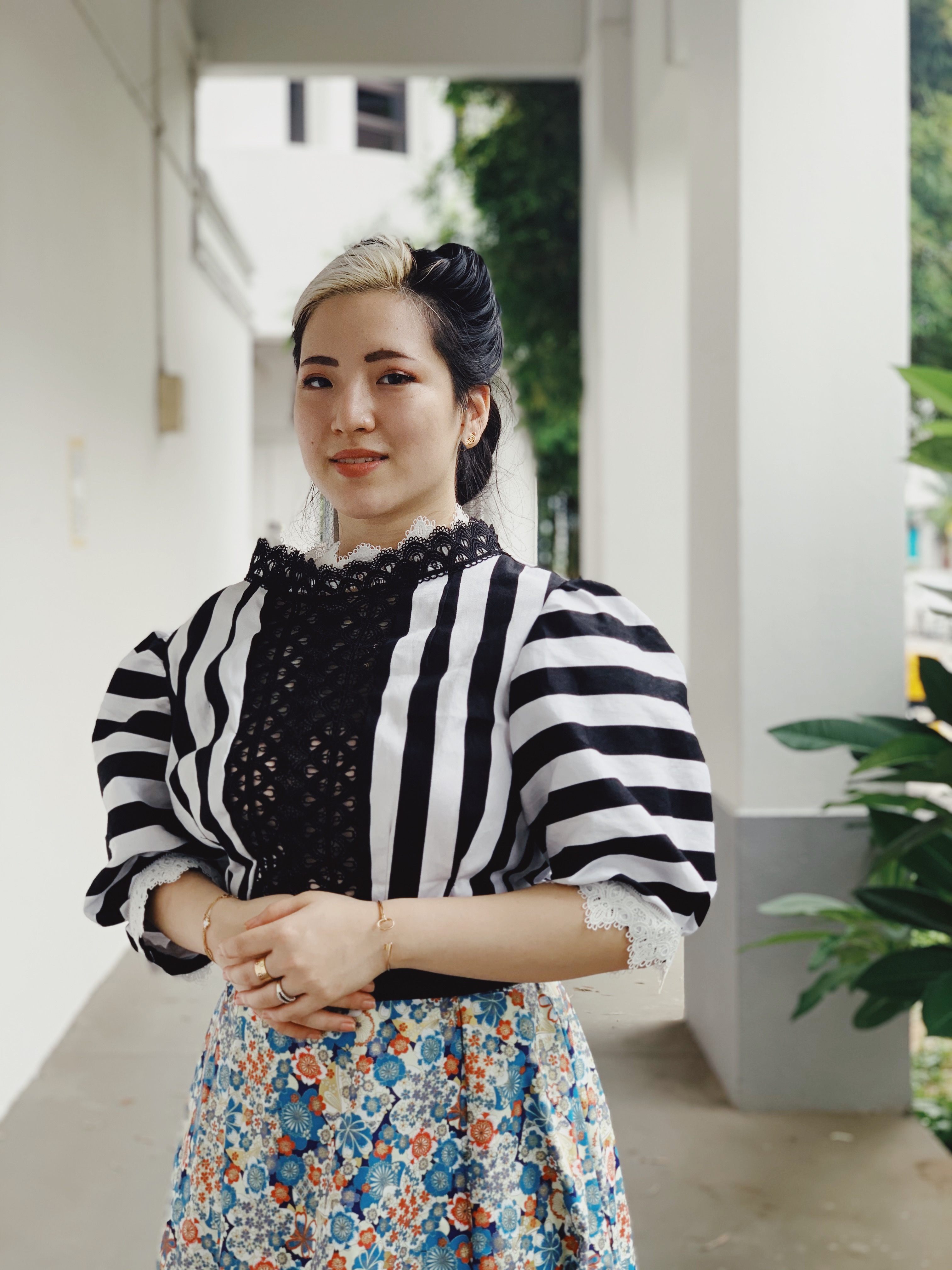 I used the pattern from the floral and red blouse although for the collar bit…I have no idea what I did. You can see how it looks kind of odd and I think I just sewed it on and flipped up?? Gosh, I have no idea what I’m doing sometimes. I did add darts to the front, and the lace panel is actually strips of lace sewn together because it was lockdown at the time and I had naught the patience to wait for my online order to trundle its way to me.
