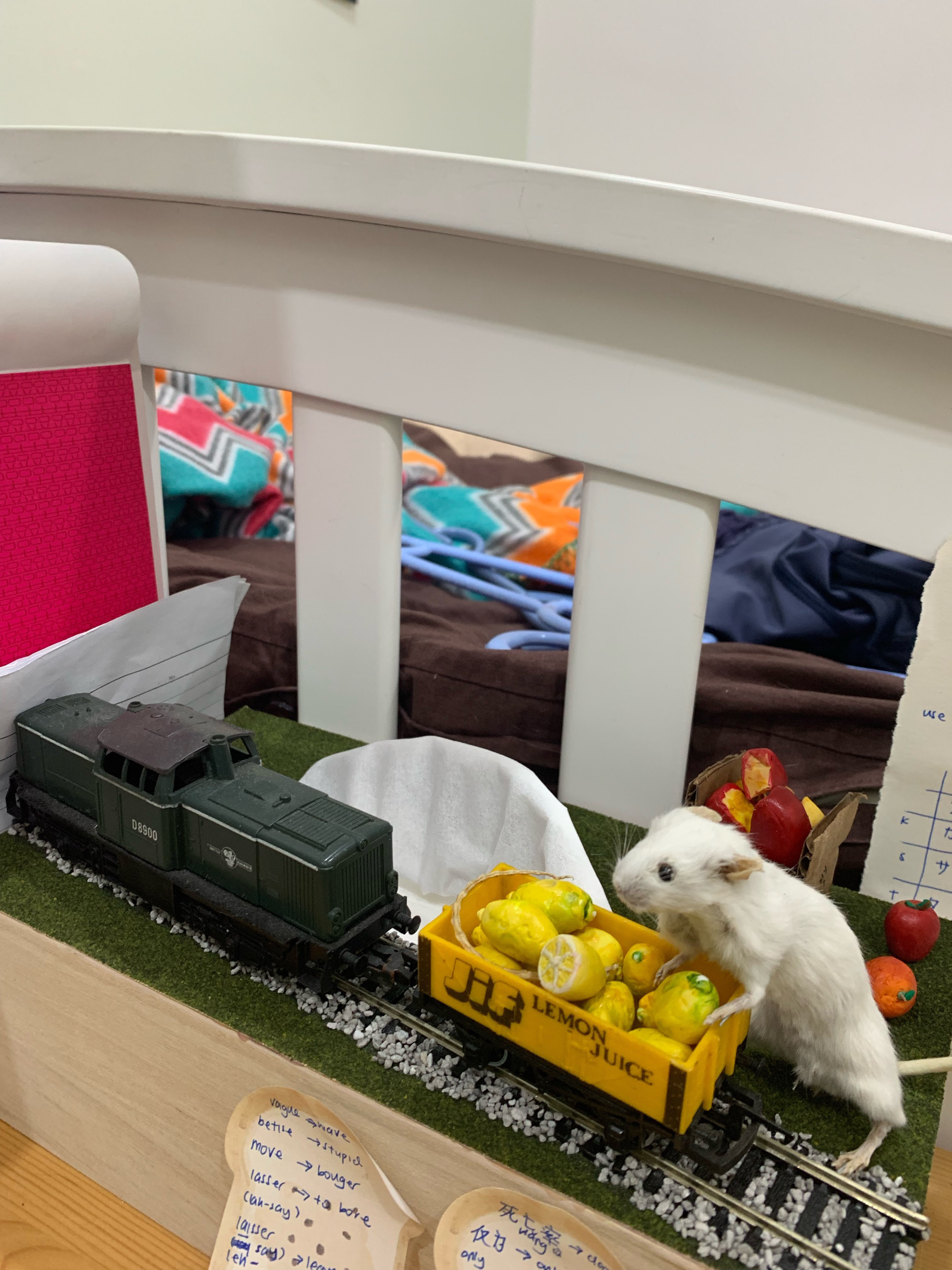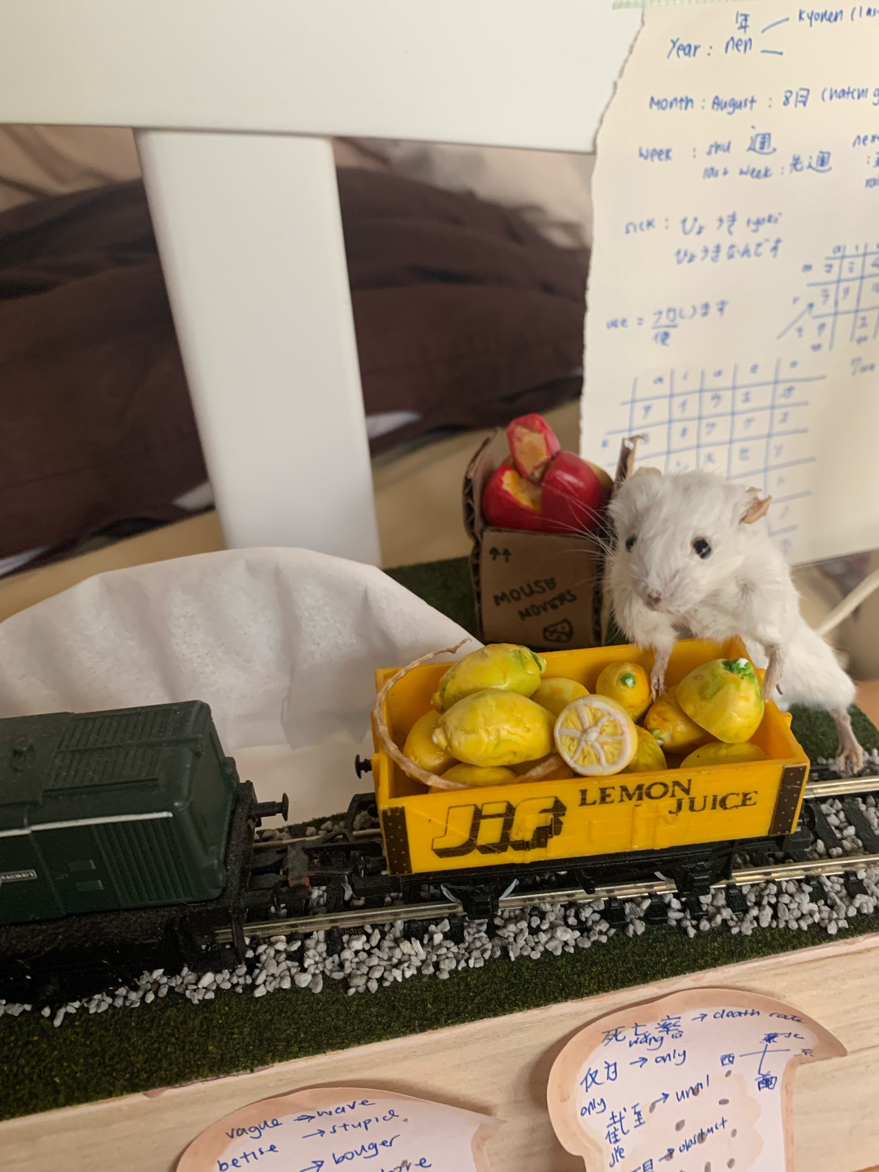 Finally, here is my taxidermy mouse Braunton moving his lemons with the help of a diesel locomotive. This scene is placed on a tissue box. I made the lemons and cheese wheels out of polymer clay