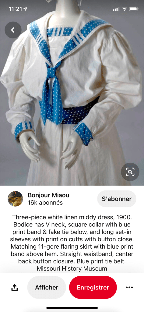 I used the the trusty truly Victorian skirt TVE21, and Folkwear Victorian bathing suit 253 pattern for the top. The stripes on the sleeves were accomplished with really thick and expensive ribbon bias binding. There is also embroidery on the sleeves and scarf that decorate the blue bias binding. This outfit is probably the favourite so far and I had a scare when I hand washed it and the blue dye got over the white. Thankfully after a wash in the machine the blue went away. I’m not exactly sure how that happened.
