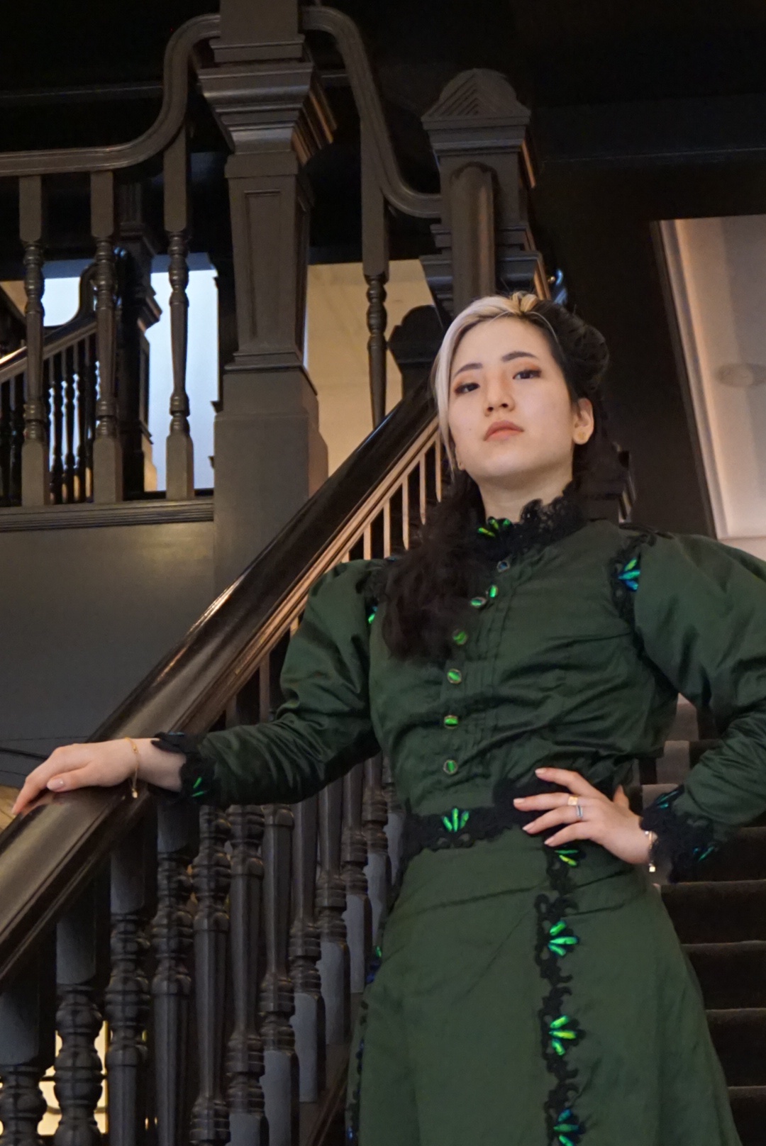 One of the pivotal moments in Daphne du Maurier’s Rebecca is when Mrs Danvers tricks the narrator into dressing up in the same costume as the previous Mrs de Winter (aka Rebecca) for the costume party. I always wondered what Danvers would have worn to the costume party, and this is the result. Going along with the botanical imagery in the novel, I chose a forest green silk dupioni. As Rebecca’s closest companion, the use of beetle wings is a subtle nod to Dany’s role in her life (the bug to the former’s azaleas). I chose a 1898 – 1900 silhouette, partly inspired by the 2012 Stuttgart iteration of the musical, where Danvers (played by the magnificent Pia Douwes) dresses in a late Victorian housekeeper outfit. The tucks on the blouse was also a detail I took from the musical costume.